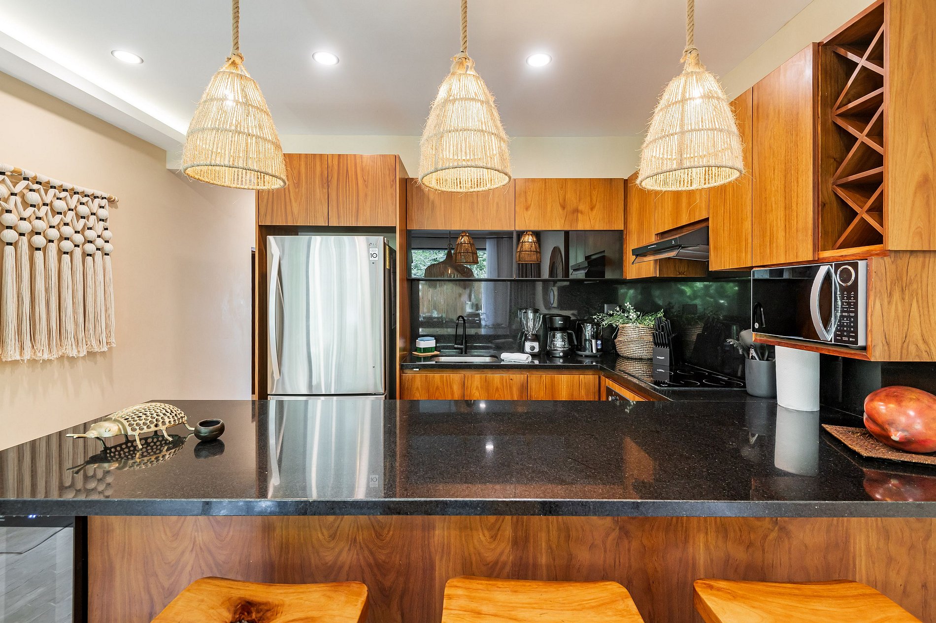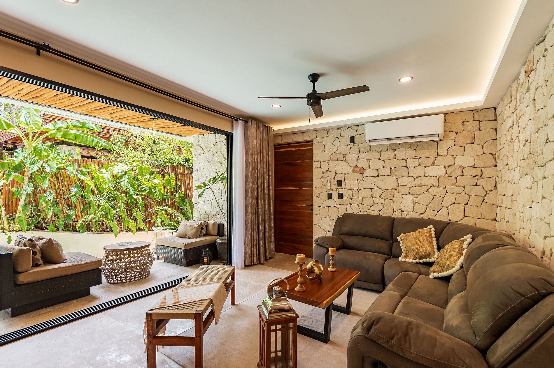 The nobility of natural materials speaks with the surroundings: Maya stone walls, Puebla marble floors, natural granite countertops, wooden trunk dividers, and finishes in chukum. Premium furnishings complement the design: a reclining sofa, parota wood table, wine cellar, and décor in natural fibers. All set in soft tones that invite calm.