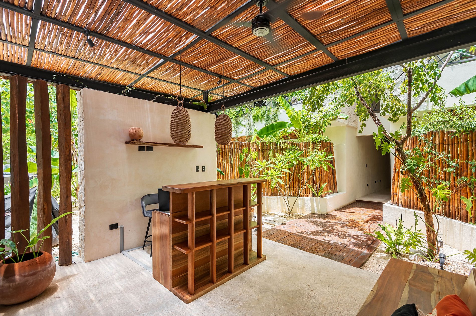 ⁓ An intimate corner within the jungle. Here, everything begins with the light that softly filters through the window, resting upon neutral tones, natural fibers, and noble finishes. Open it, and life flows toward a small private patio with a table and chairs — the perfect setting for sunrise coffee or a late-night conversation under the stars. ⁓