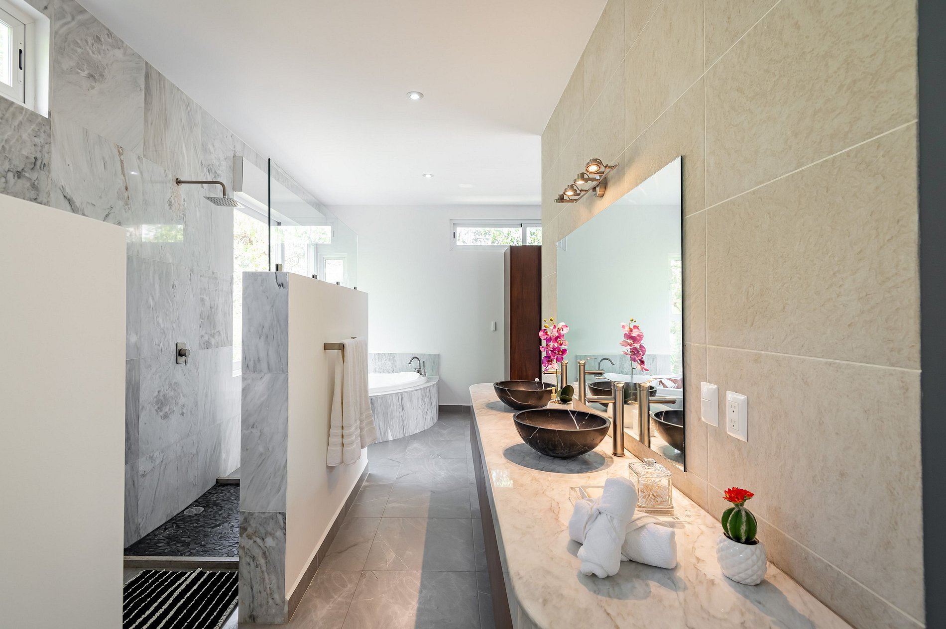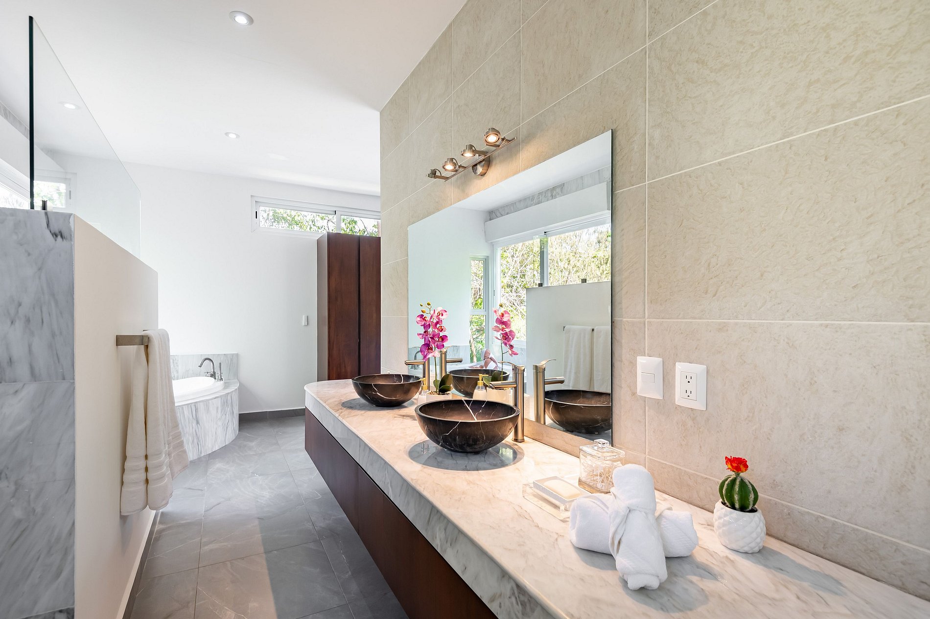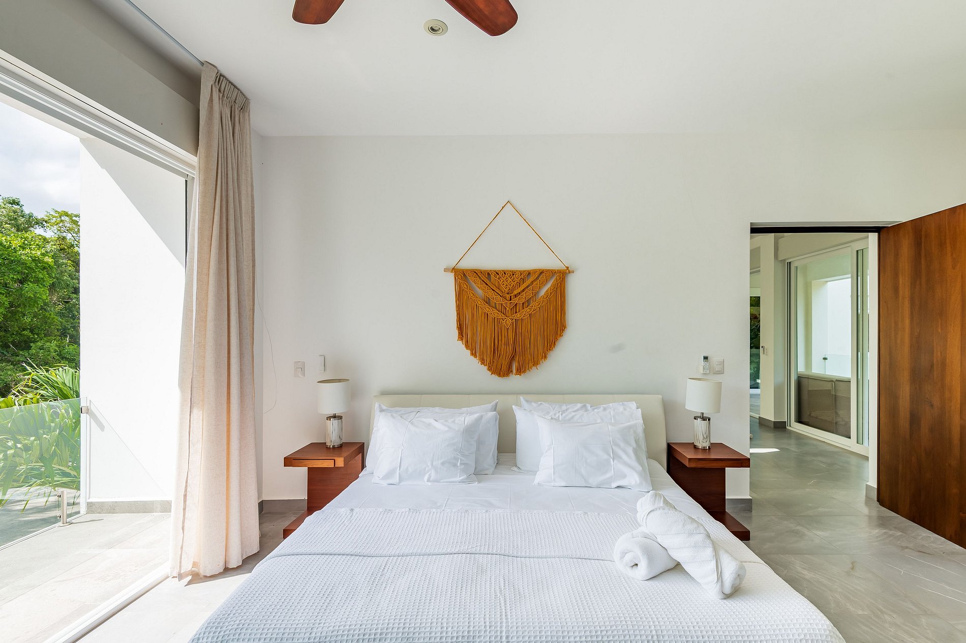 ৹ Con tres suites principales, cada una con su baño privado, disfrutarás de comodidad y privacidad. ৹ Tonos suaves, ventanales panorámicos y espacios cuidadosamente diseñados te invitan a relajarte y sumergirte en la selva que te rodea.