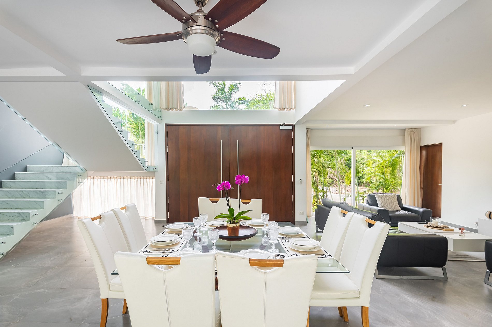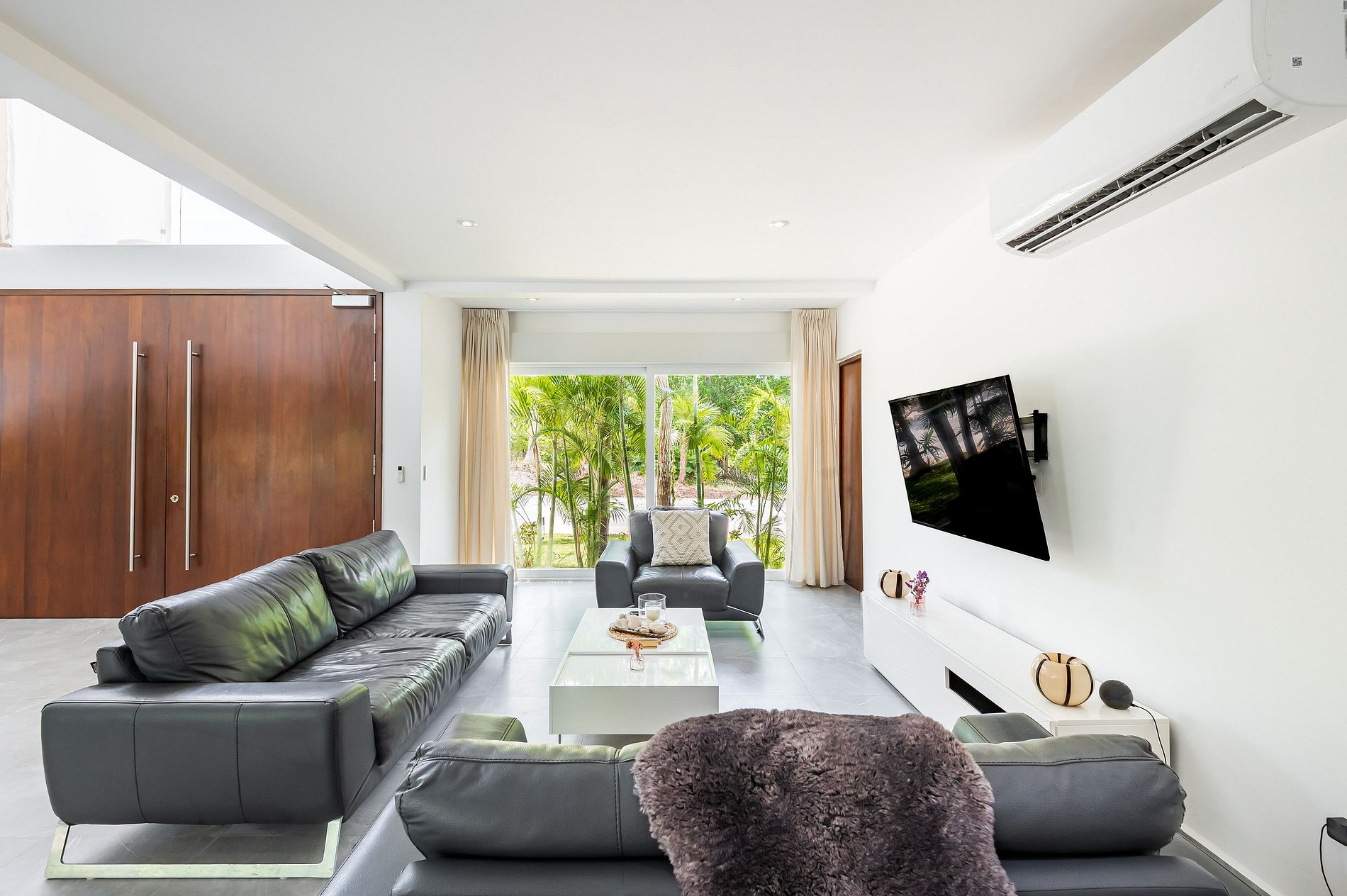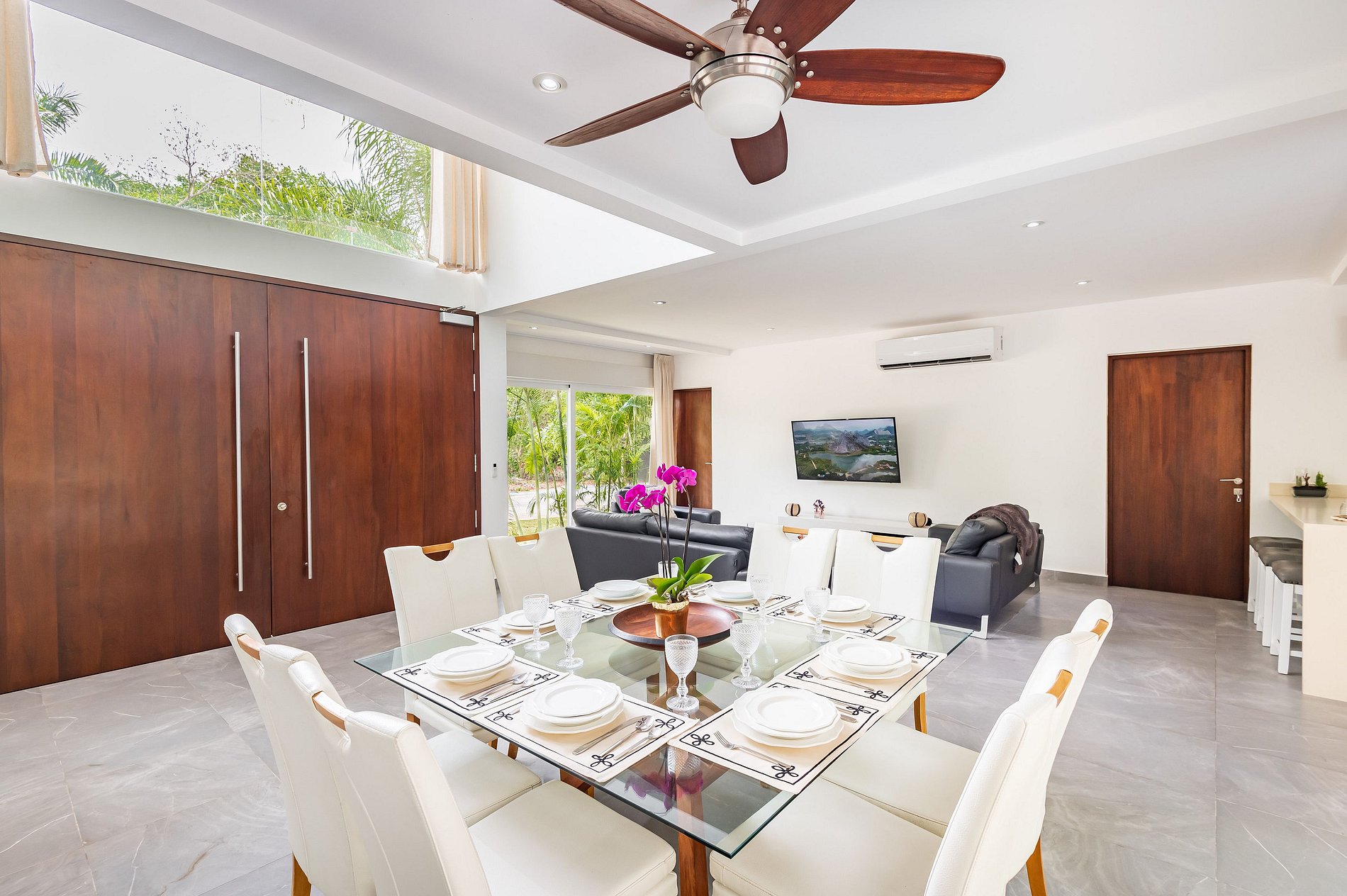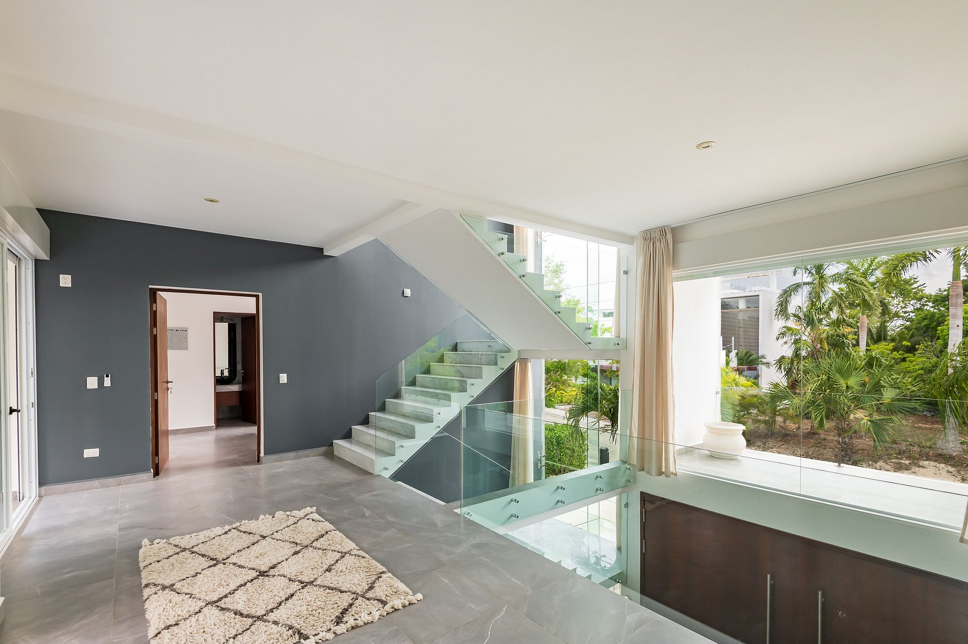 ৹ Ventanales de piso a techo que disuelven la línea entre el interior y el exterior, llenando el espacio de luz y naturaleza.