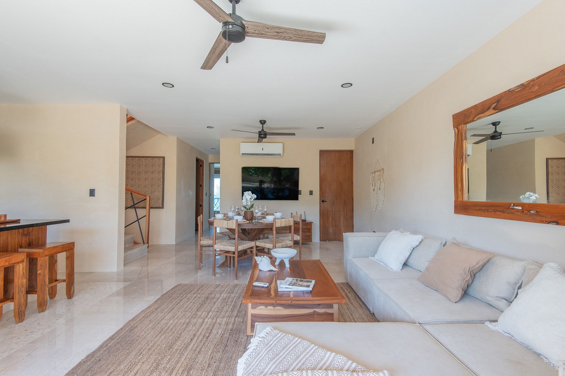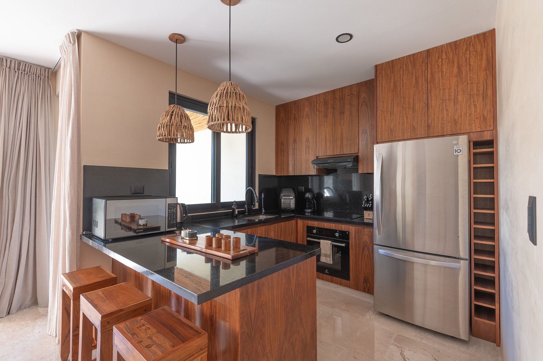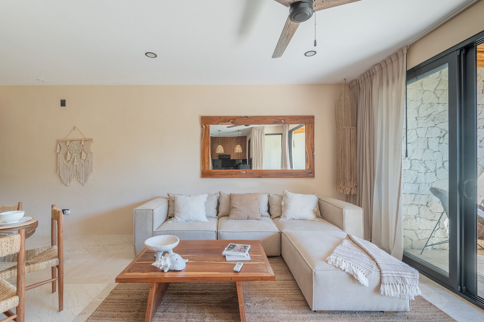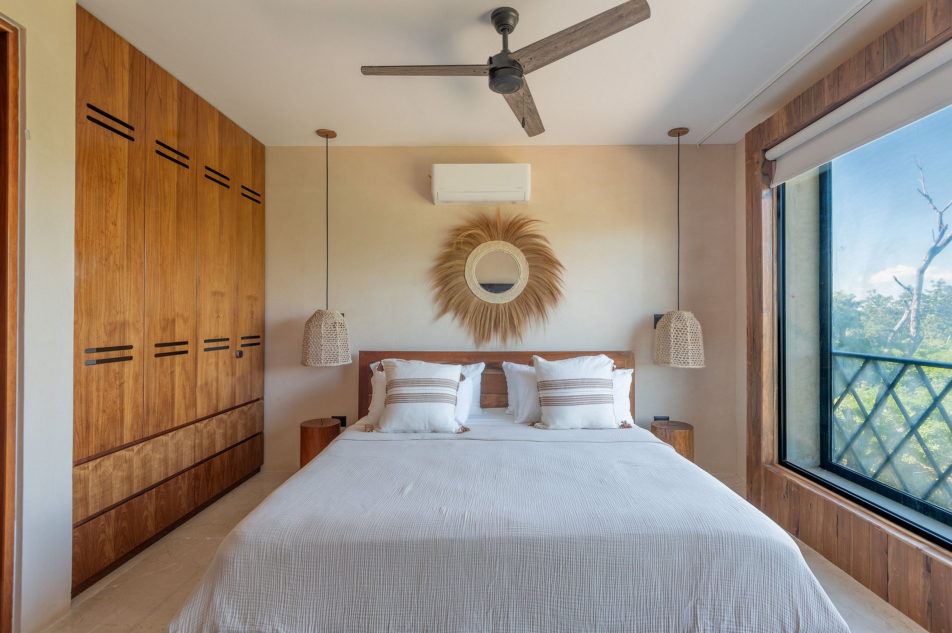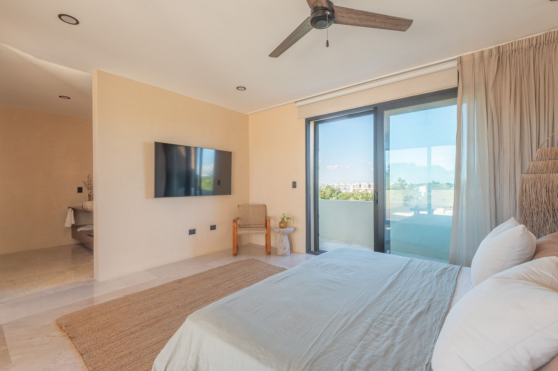Además, el departamento dispone de un sistema de aislamiento acústico con doble ventana en las recámaras, diseñado para proteger el interior del sonido exterior y asegurar un descanso profundo, incluso en un entorno vibrante como Tulum.