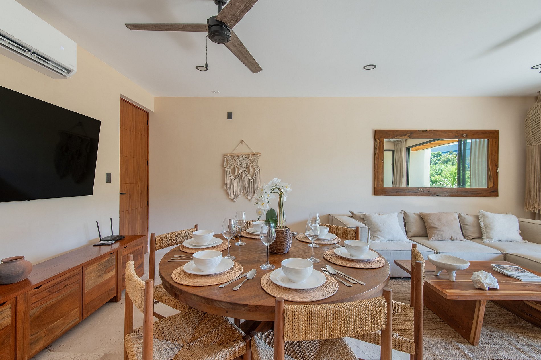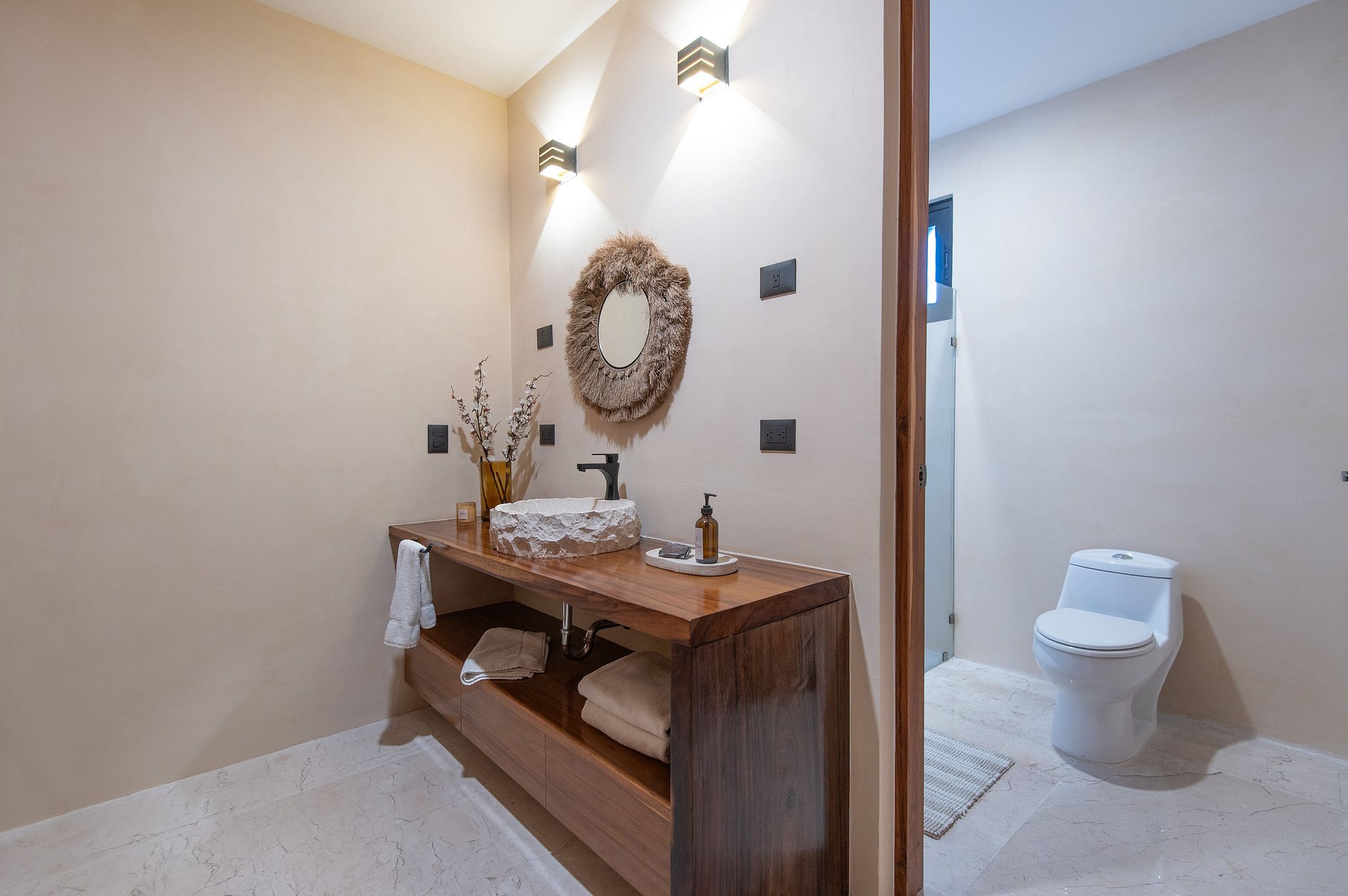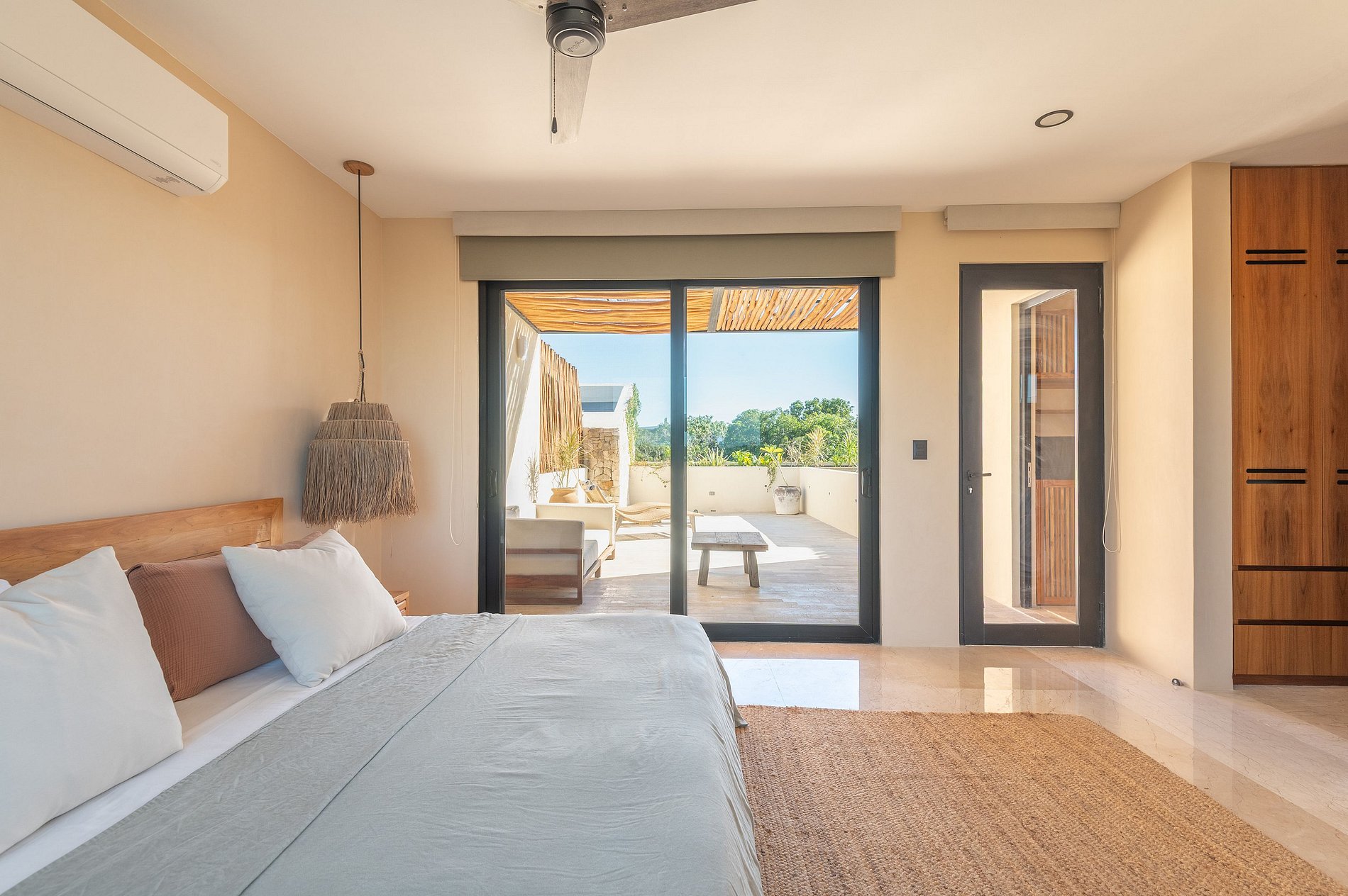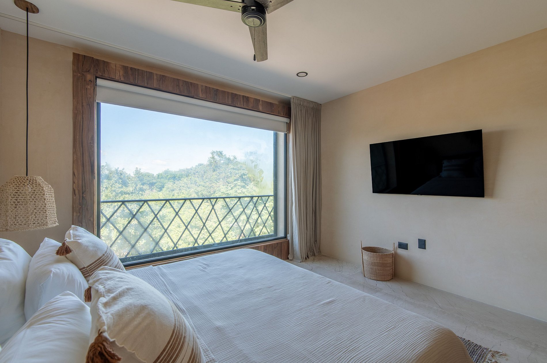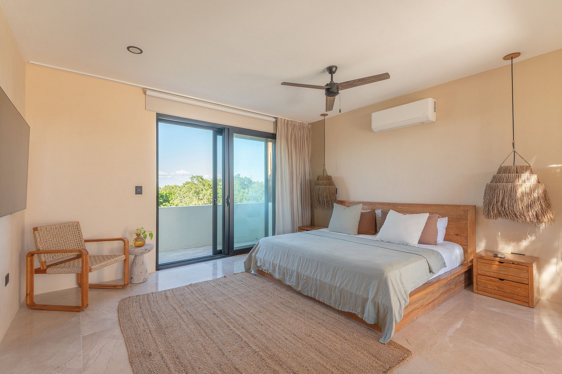 Además, el departamento dispone de un sistema de aislamiento acústico con doble ventana en las recámaras, diseñado para proteger el interior del sonido exterior y asegurar un descanso profundo, incluso en un entorno vibrante como Tulum.